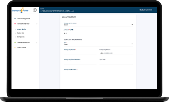 Demand notice is automatically generated based on a template setup by a government official or consultant with an access and sent to a company for a particular levi due to them, it usually consists of the name of the company, the amount due, the period and date of expected payments. The notices can be sent to the company via email or a physical copy.